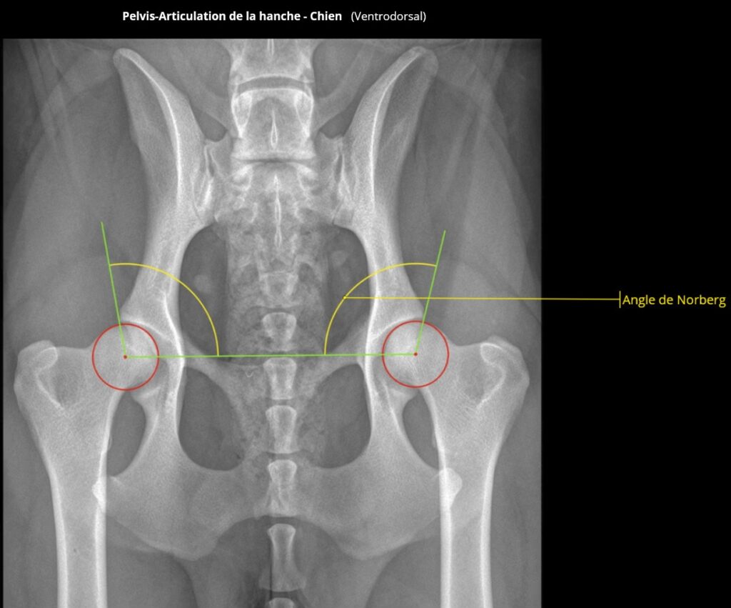 Voir ci-dessous quelques clichés où l’angle de NORBERG-OLSSON est représenté, suivant le stade de la dysplasie :