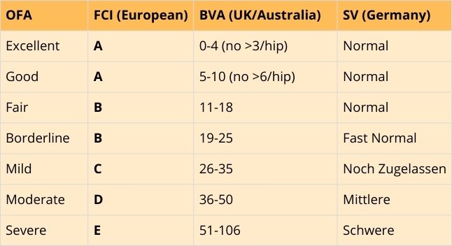 En Europe, la gravité de la dysplasie est classée en 5 stades, allant de A (hanches normales) à E (forme sévère), d’autres organismes internationaux utilisent des notations différentes.